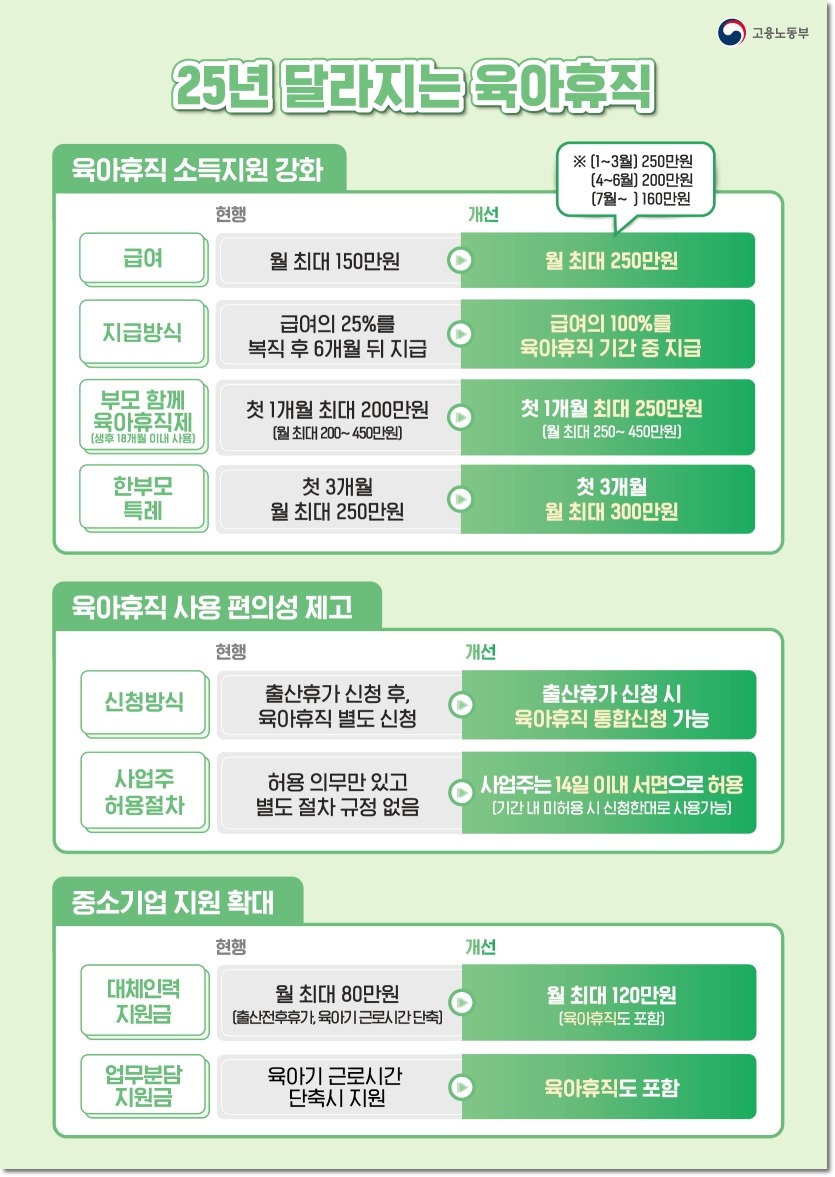 - 부모 동시 육아휴직제: 생후 18개월 내 첫 달 상한액 250만 원으로 인상